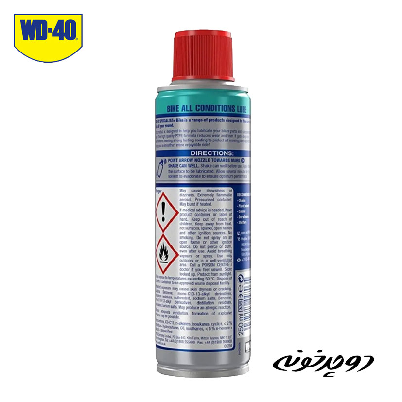 اسپری روغن WD-40 Bike All Conditions Lube 250ml با فرمولاسیون PTFE، برای دوچرخهسوارانی که در تمام شرایط آب و هوایی رکاب میزنند، طراحی شده است تا عملکرد زنجیر و سیستم دنده را در مسیرهای خشک و مرطوب تضمین کند.
